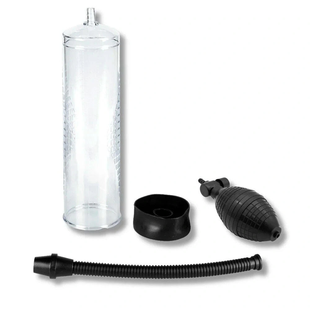 - Pegue o anel de vedação e coloque-o na base do pênis. Insira o pênis no cilindro transparente e use a bomba manual para criar o vácuo e iniciar o processo de sucção.
